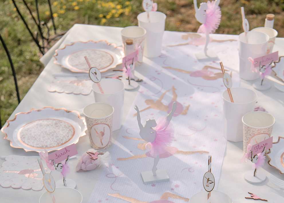In unserem Onlineshop findest du Partygeschirr mit rosegoldenen Applikationen, Strohhalme und Servietten in rosafarbenem Design. Wände und Decken lassen sich durch rosa Pompoms, Konfetti-Ballons und Tüllstoffe in einen echten Mädchentraum verwandeln. Für die Tischdekoration kannst du auf zarte Blumen setzen und die Vasen mit passendem Schleifenband verzieren. Tischläufer aus Pailletten oder mit glitzernden Details runden das Ballerina-Bild perfekt ab.