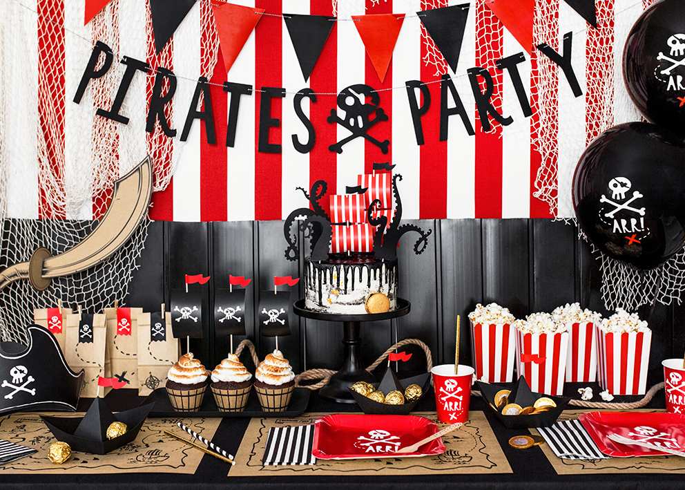 Im Konfetti-Alarm-Onlineshop findest du viele verschiedene Dekoartikel, die eure Piratenparty zu einer Fete werden lassen, bei der auch die gefürchteten Seeräuber gerne mitgefeiert hätten. Tischläufer mit dem Aufdruck einer historischen Landkarte sowie Servietten, Partygeschirr und Luftballons mit Totenkopfmuster oder rot-weißen Streifen – ähnlich wie die eines Segels – lassen eure Tische zu einer Festmahlstafel für echte Seeräuber werden. Mit schwarzen Kerzen und historischen Kerzenständern kann die Tischdekoration zusätzlich aufgewertet werden. Für die Raumdekoration eignen sich Seetau, Anker-Motive, Wimpelketten und Luftballons in Schwarz, Weiß, Rot und Braun. Wer seinen Gästen eine Freude bereiten möchte, könnte über kleine selbstgebastelte Schatzkisten nachdenken, die mit Süßigkeiten oder anderen Aufmerksamkeiten befüllt sind.