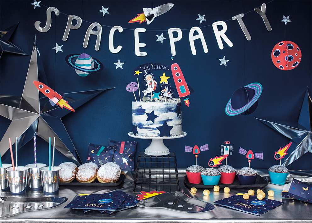 Marsmännchen, Raketen, Sterne und Co. sollen das zentrale Thema eurer nächsten Party sein? Im Konfetti-Alarm-Onlineshop findest du sicher alle Deko-Elemente, die du für eine Space-Feier braucht. Um deine Partylocation einen echten Weltraum-Flair zu verleihen, solltest du dir für silberne Wandvorhänge oder Girlanden aus Sternen entscheiden.